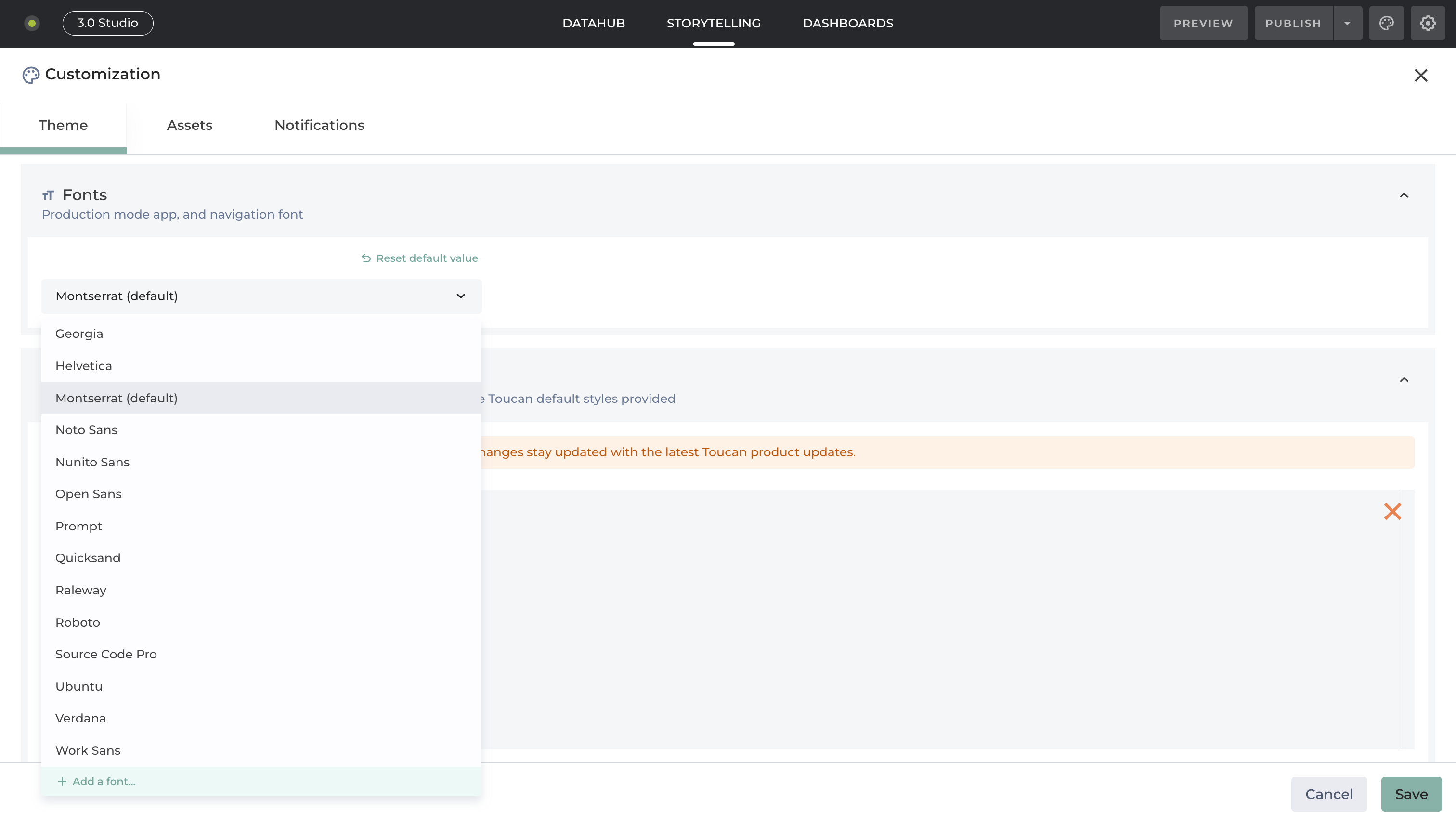 For customers embedding Toucan in their software, **Toucan must align seamlessly with your product's Design System/Guidelines, where the font plays a pivotal role** in meeting those expectations. In the past, changing the fonts in a Toucan app required using Custom CSS and making educated guesses about class names used within Toucan – but that's now a thing of the past 🤠 ! We've revamped the process for a more streamlined experience.