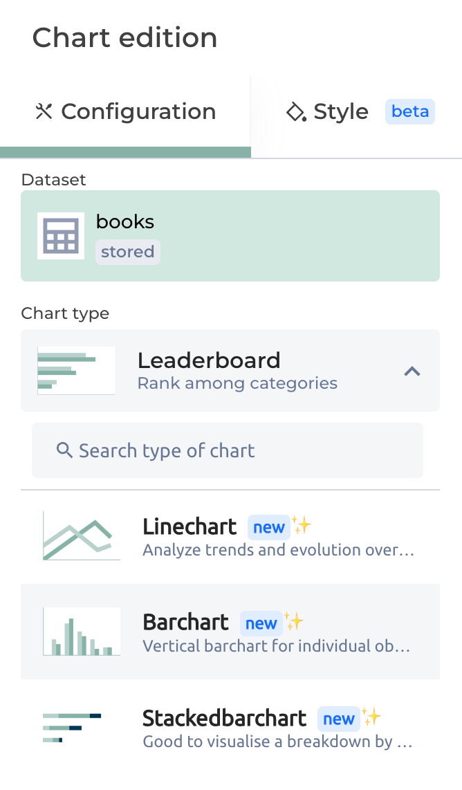**Where to access:** Access is enabled for all V3 Toucan Users. The new chart types can be selected from the dropdown menu in the smart editor, where they are highlighted with a **NEW✨** icon.