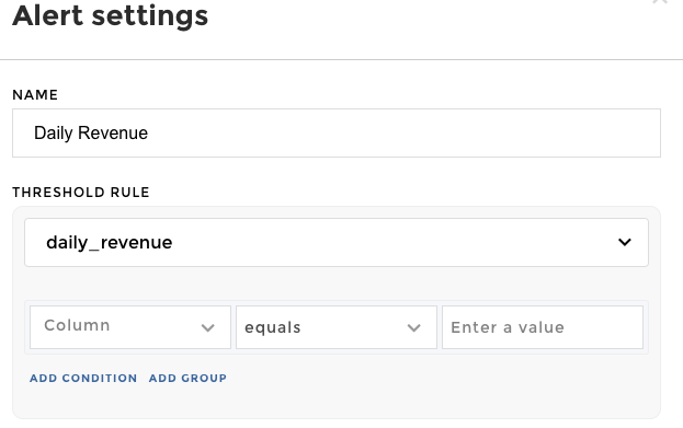 * Depending on what rules my revenue data lives in the dataset “daily\_revenue,” select it in the menu "Threshold rule."