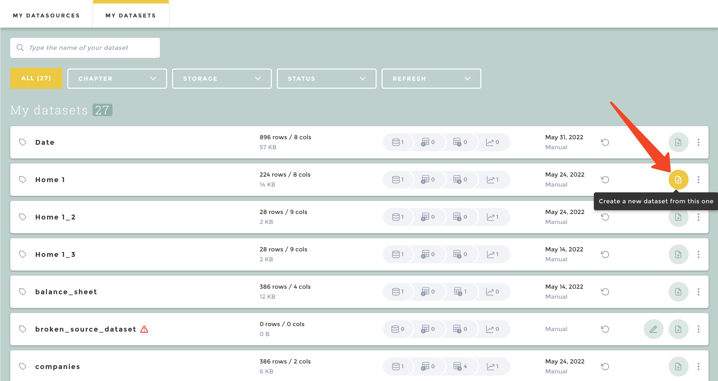 1. Click on the <i class="fa-file">:file:</i> with a plus icon (“Home 1” in the example) on hover a label “Create a new dataset from this one” will be displayed