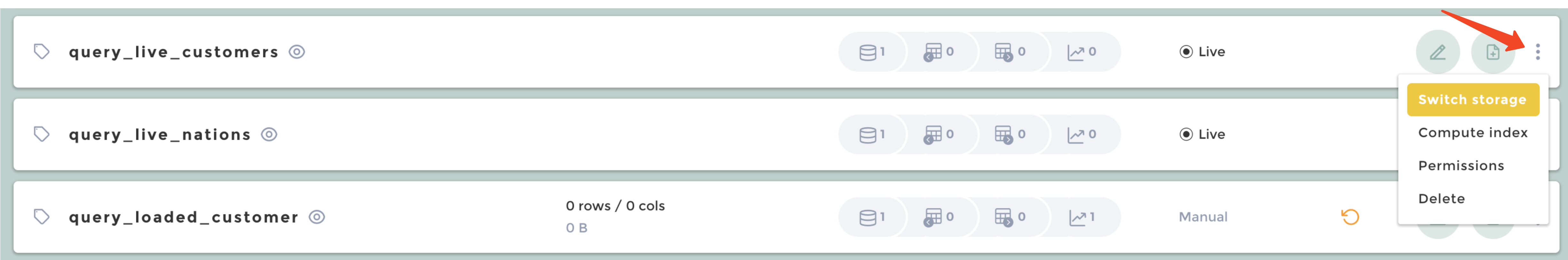 1. Go to the action menu of the dataset, and click on "Switch storage"