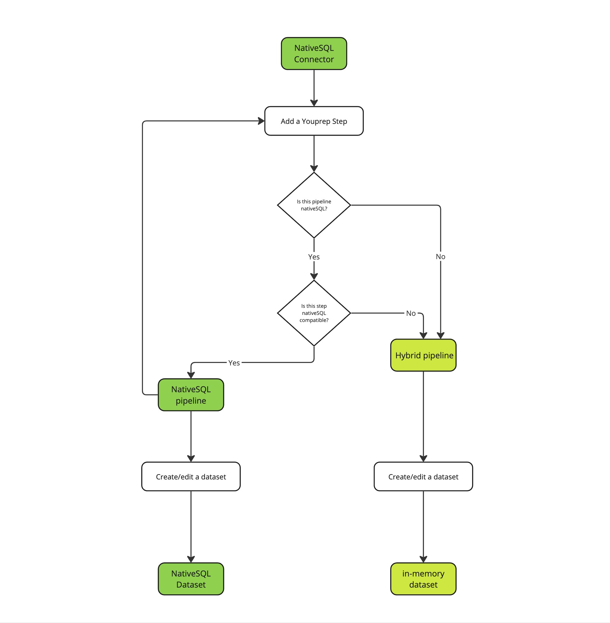 [Hybrid Pipeline](https://www.toucantoco.com/en/blog/product-release-hybrid-pipelines) is a Toucan feature that allows to optimize the execution of data transformation pipelines by intelligently combining [Native SQL](https://docs-v3.toucantoco.com/data-management-in-datahub/datasets-in-toucan/preparing-data/youprep-tm-native-sql) execution (e.g. the possibility to create Data transformation pipeline that will be translated in SQL and executed by the datasource) and in-memory processing where the steps are executed on the Toucan engine in-memory.