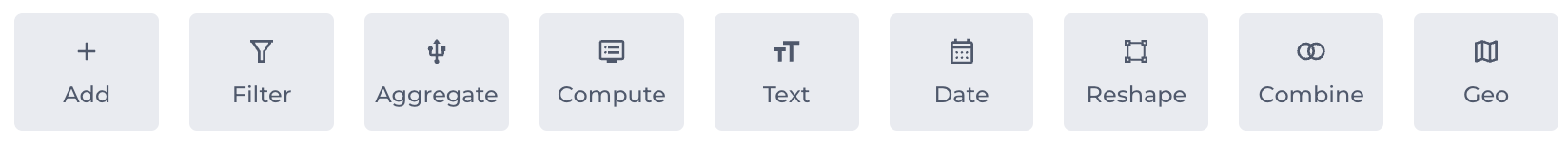 Toucan has implemented different data transformation steps (filtering, computation, aggregation, text and date operations, reshaping, and combining several datasets)