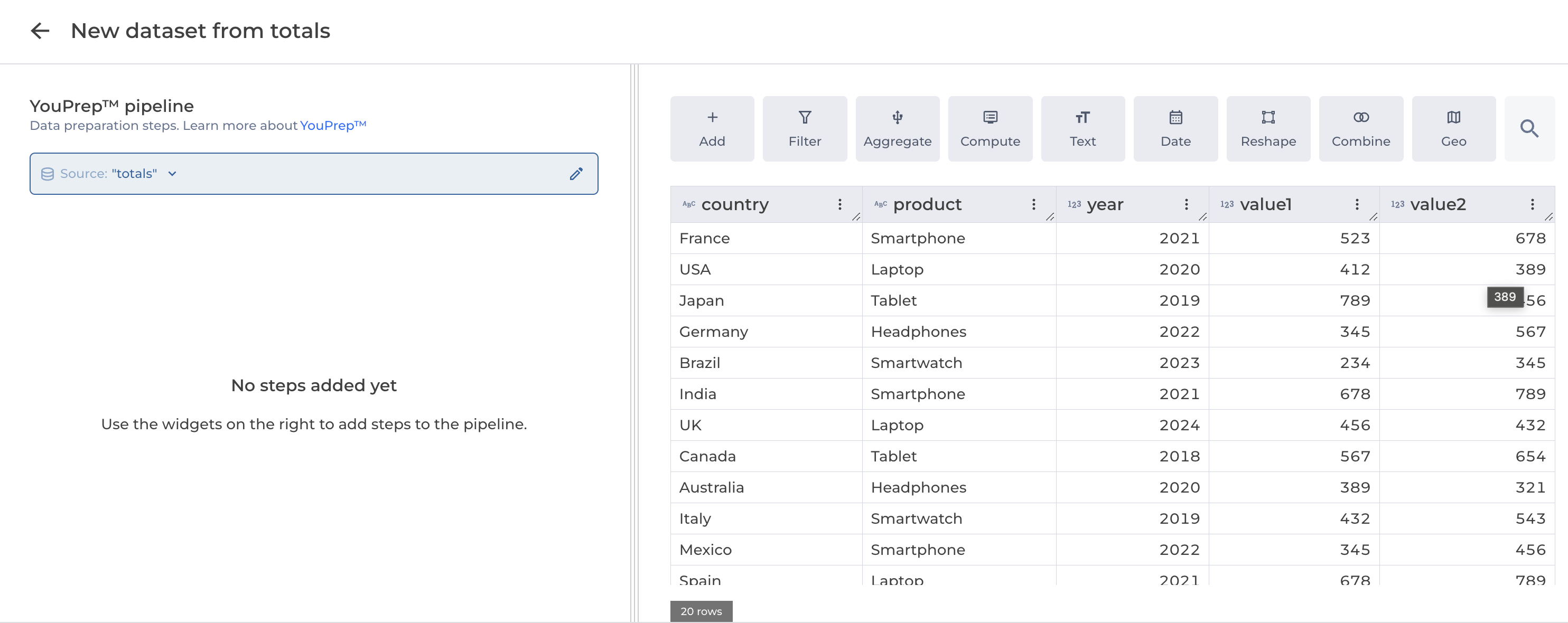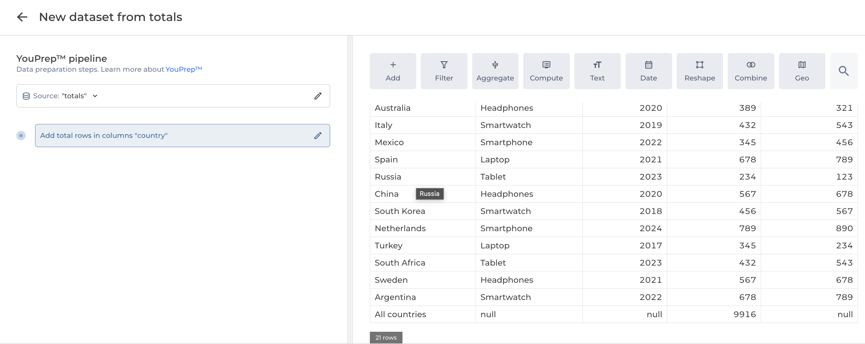The Add total rows step allows you to compute “Total” columns and append those rows to your current dataset