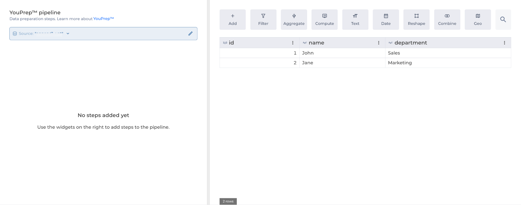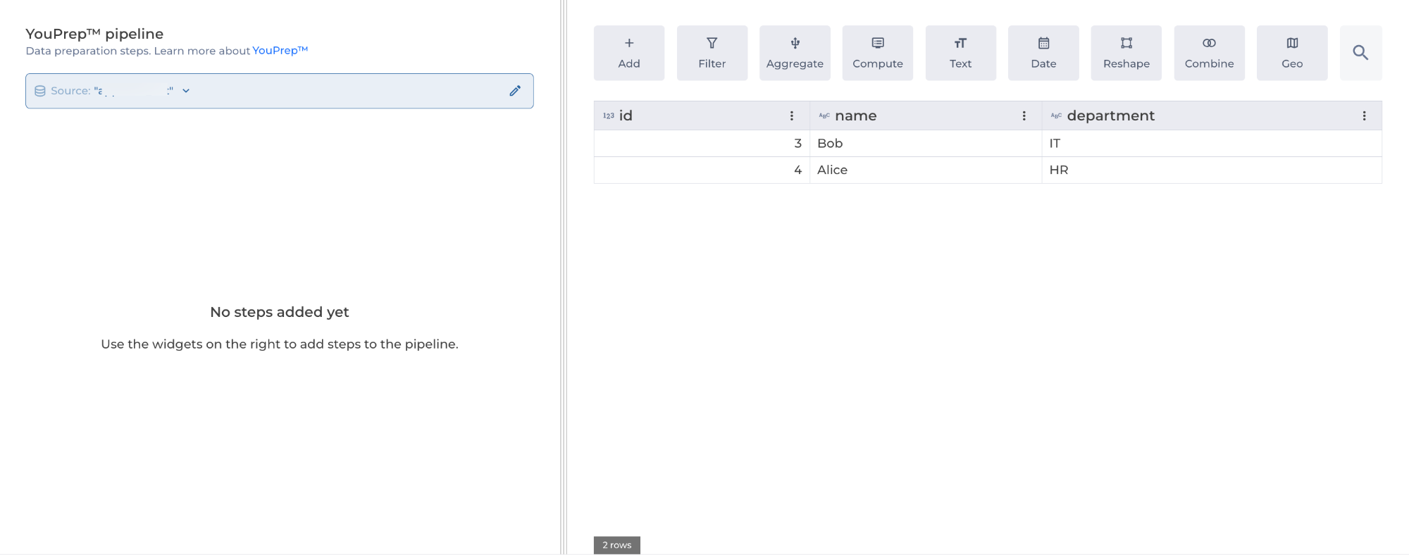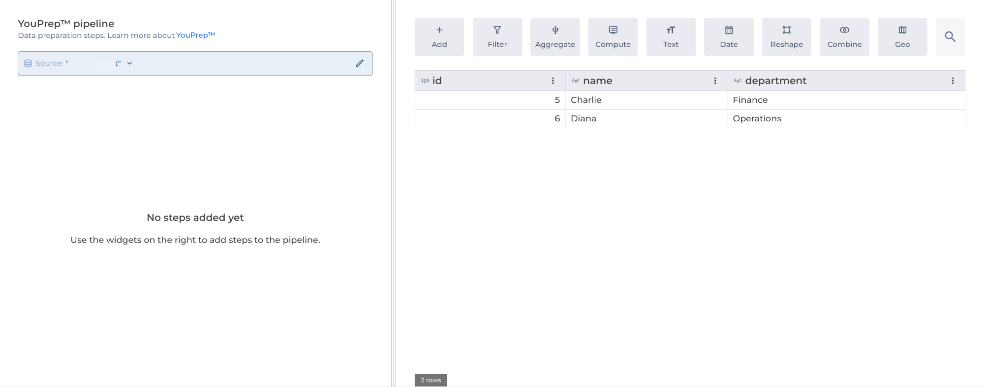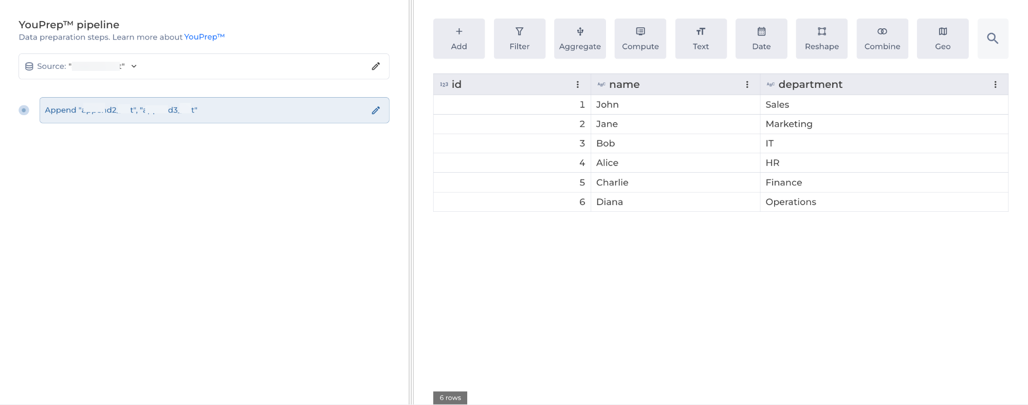 The Append step allows you to combine multiple datasets (listed in the DataHub) vertically, adding rows from other datasets to the current dataset.