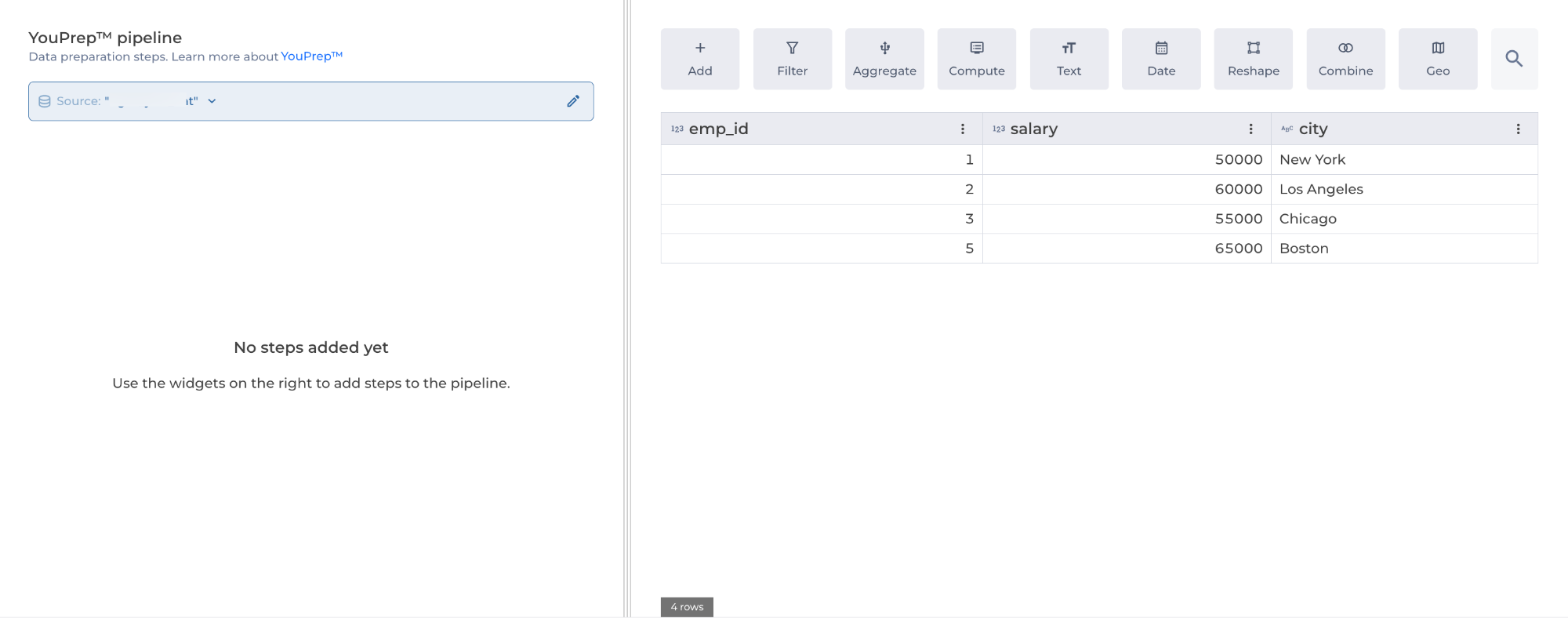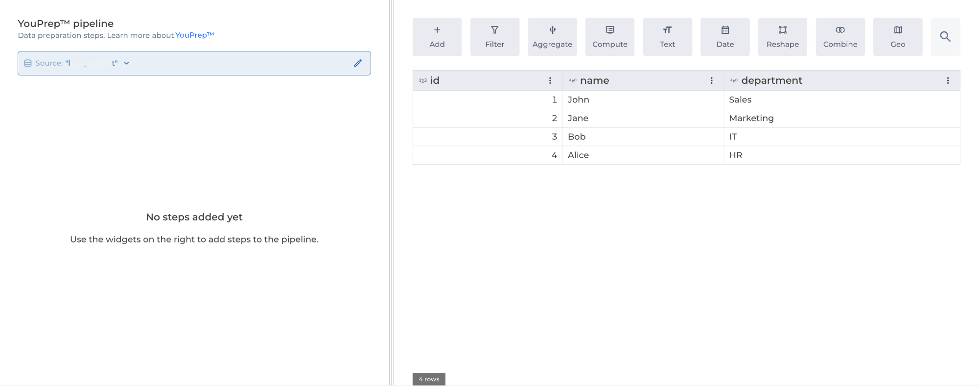 The Join step allows you to combine two datasets listed in the dataHub to bring columns from the former into the latter, matching rows based `on` columns correspondance