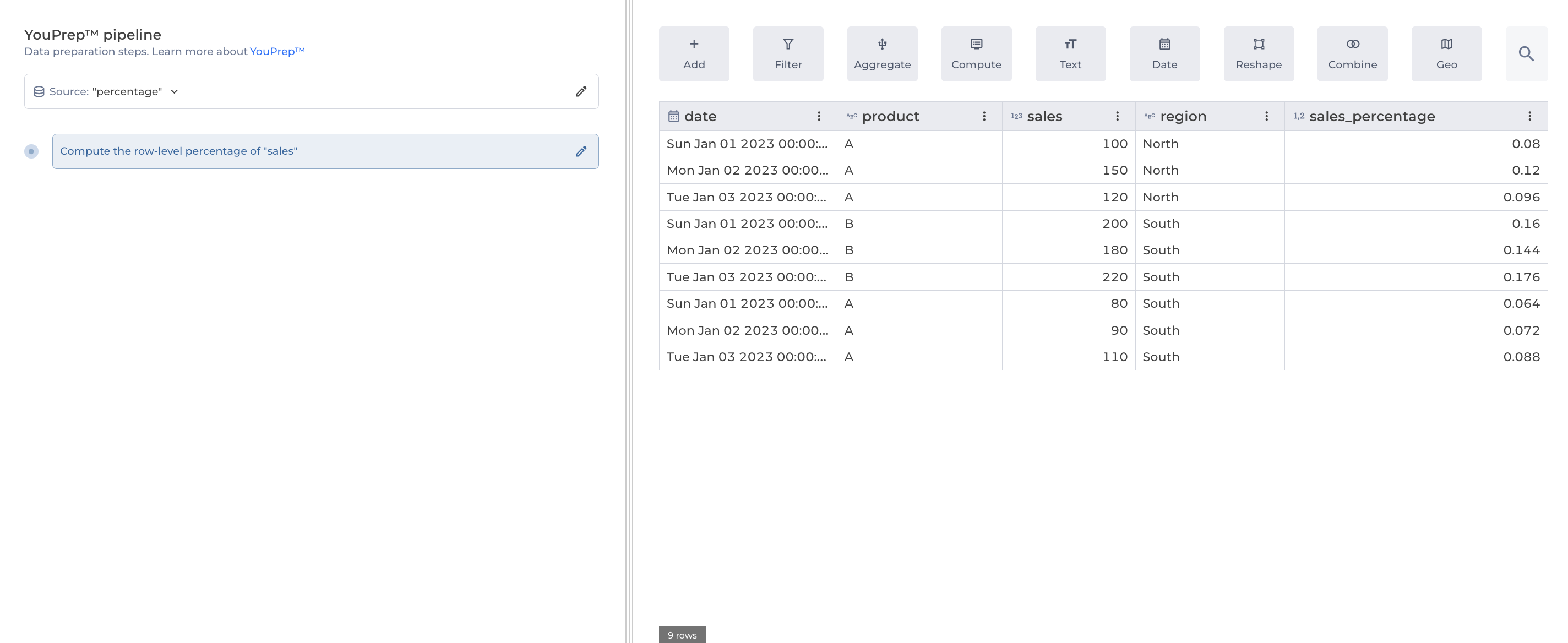 The Percentage of total step helps you calculate the relative proportion of each value within a total, optionally within specified groups. It's essential for understanding the composition of your data and relative contributions.
