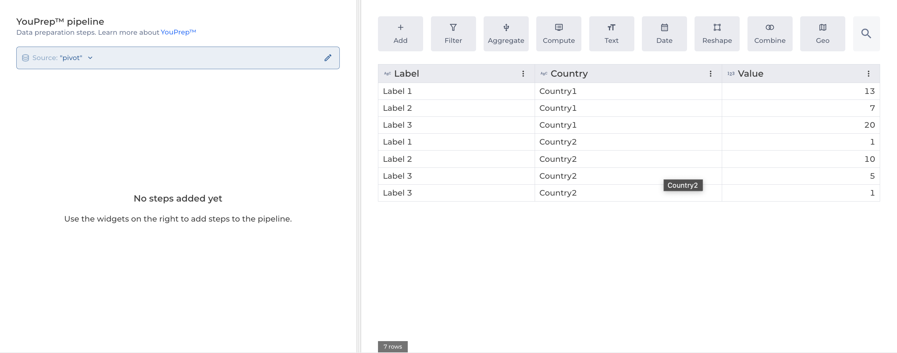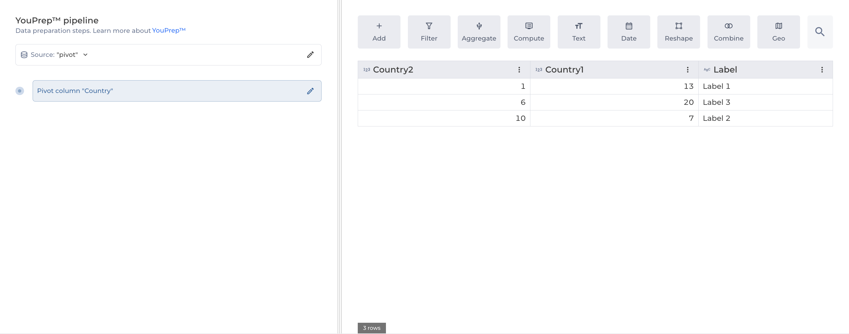 The Pivot step allows to transform rows into columns. It is the reverse operation of an `unpivot` step.