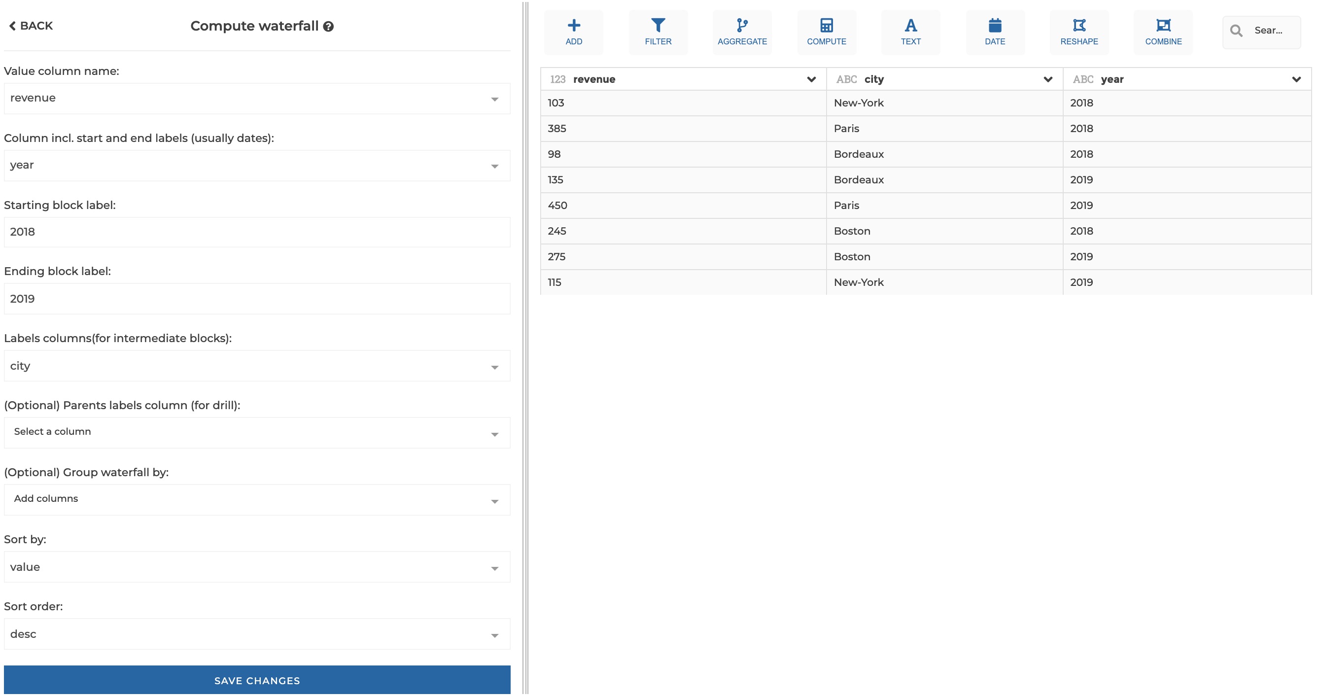 * `(Optional) Group waterfall by`: the columns used to group waterfall computation (useful to keep track of a column used for filtering for example)