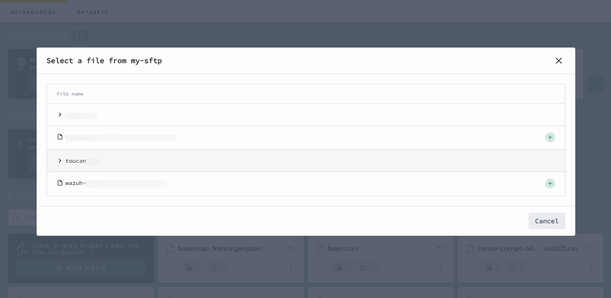 To create a dataset from a Remote file storage connection, click on "Import a new file from this storage". You will then be able to: