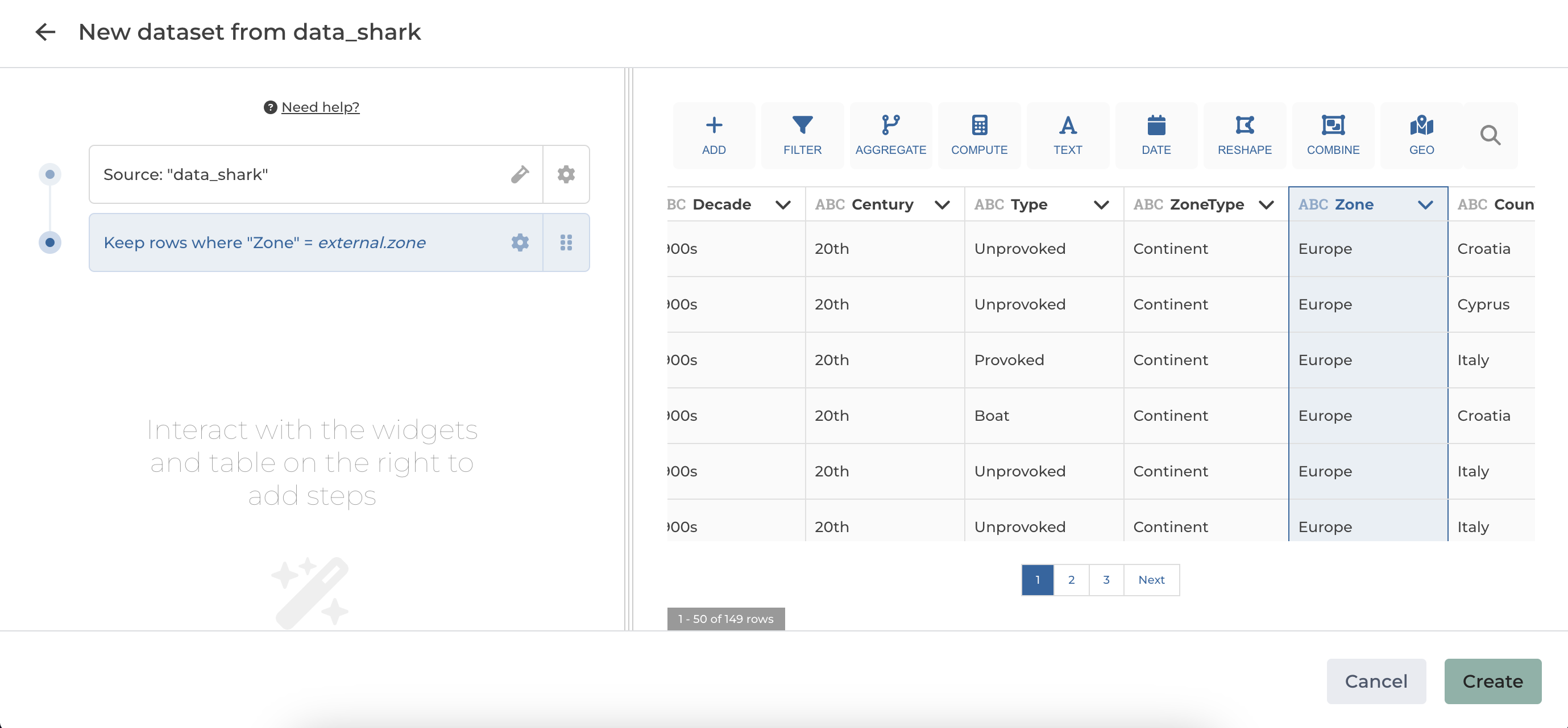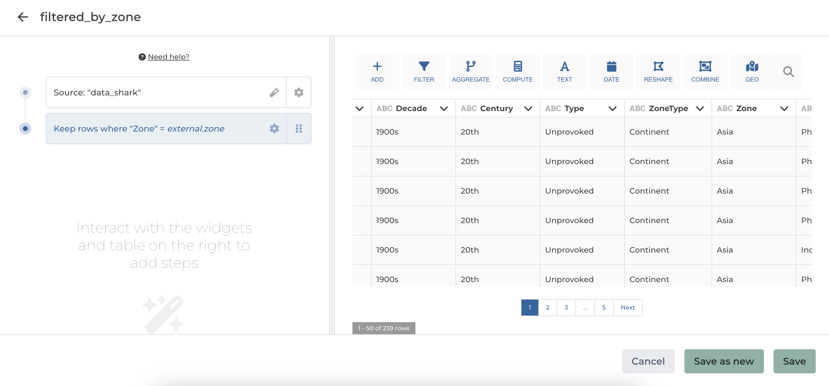 If you add for example a filter rows step to filter your dataset by clicking on the chip variable to display a menu containing all the variables of your app.