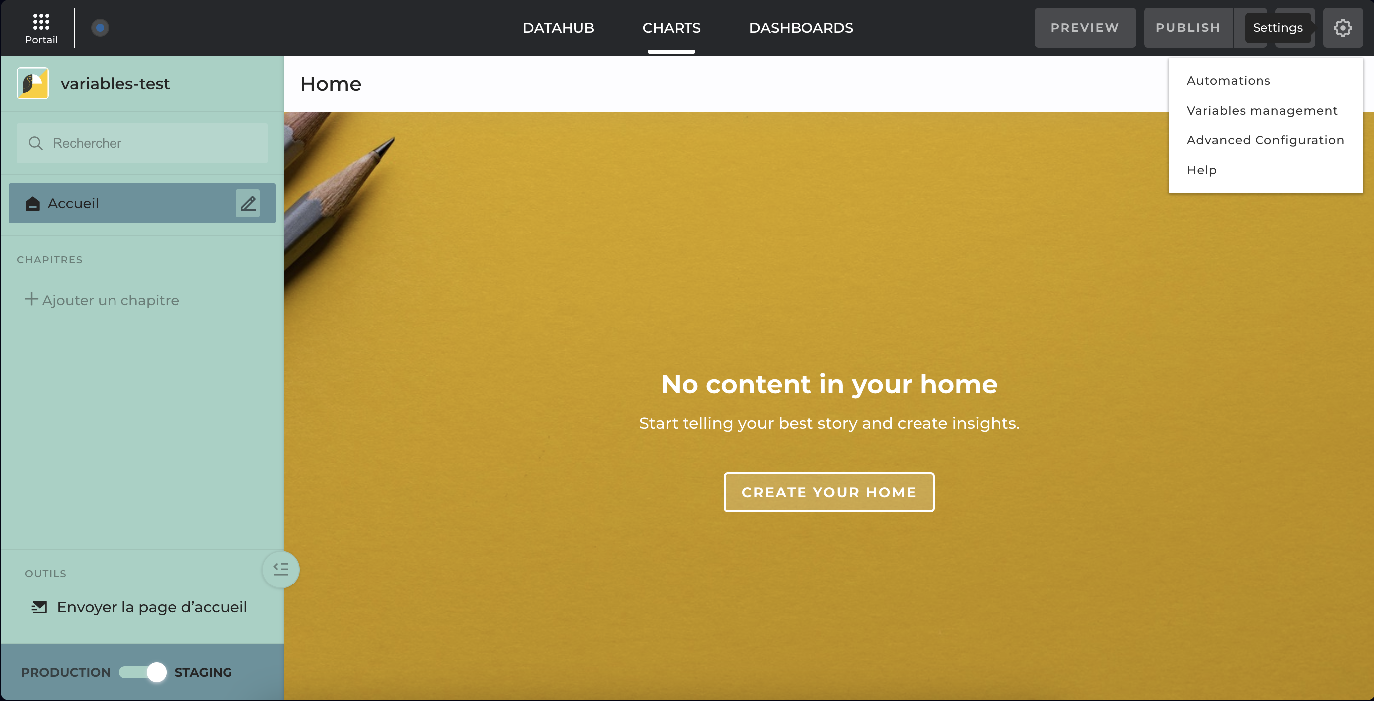 To manage variables, go in staging mode, in the settings menu of your app, as an app-builder, you have access to a new option: **Variables Management**.