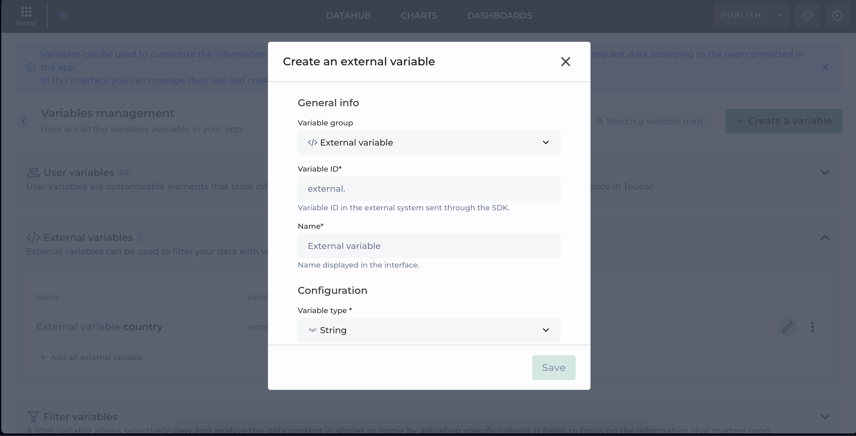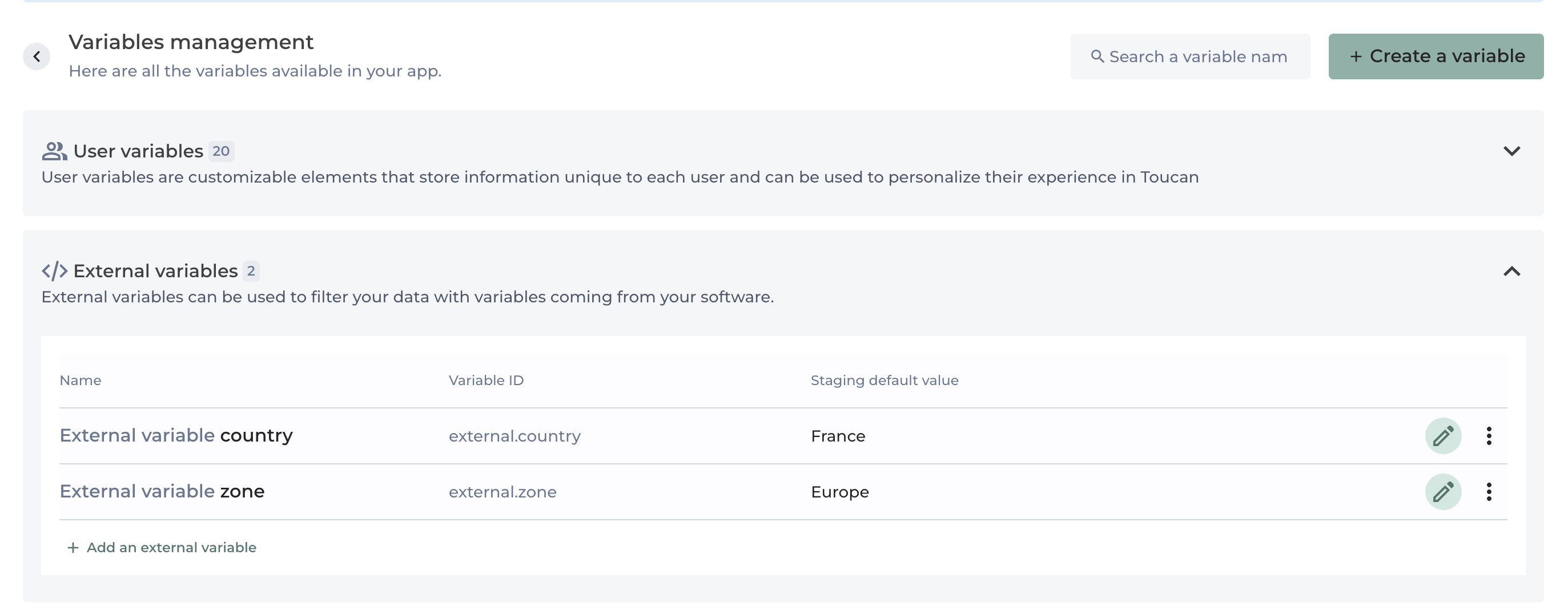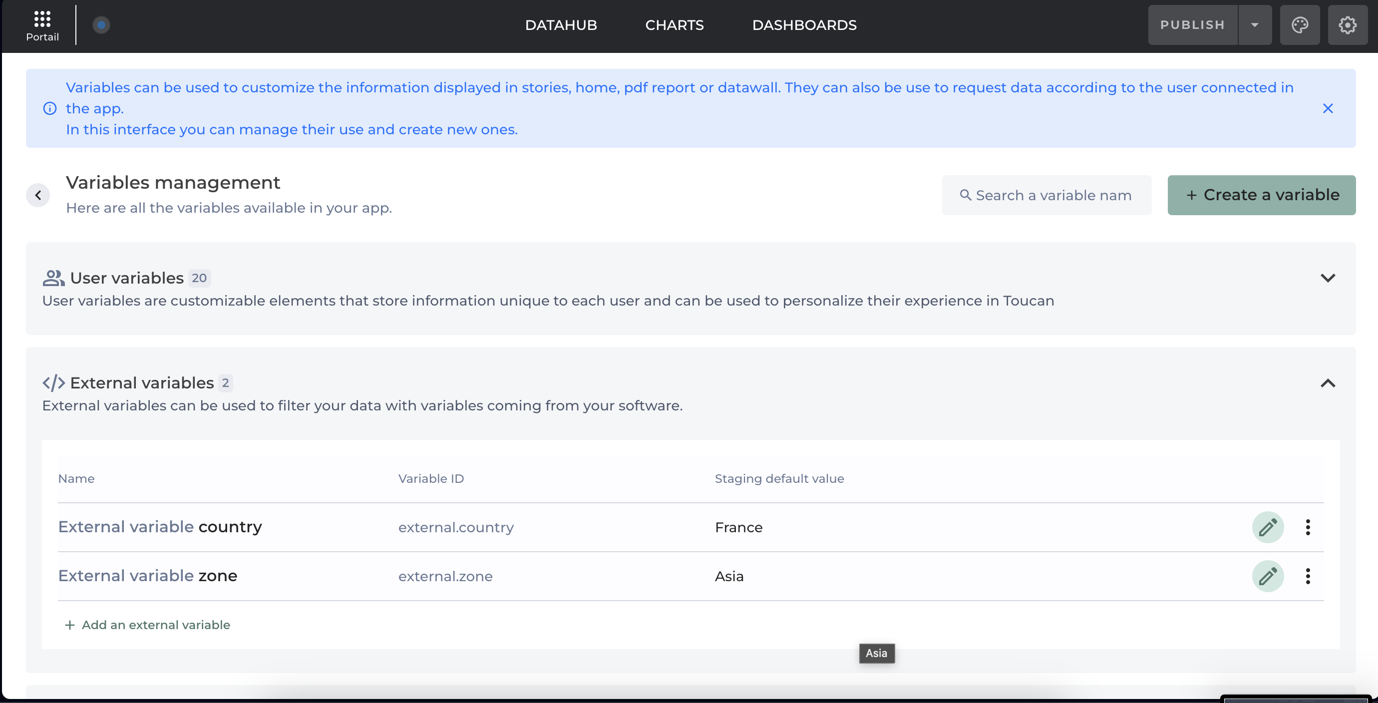 **External variables** can be created directly in the Variables Hub.\
