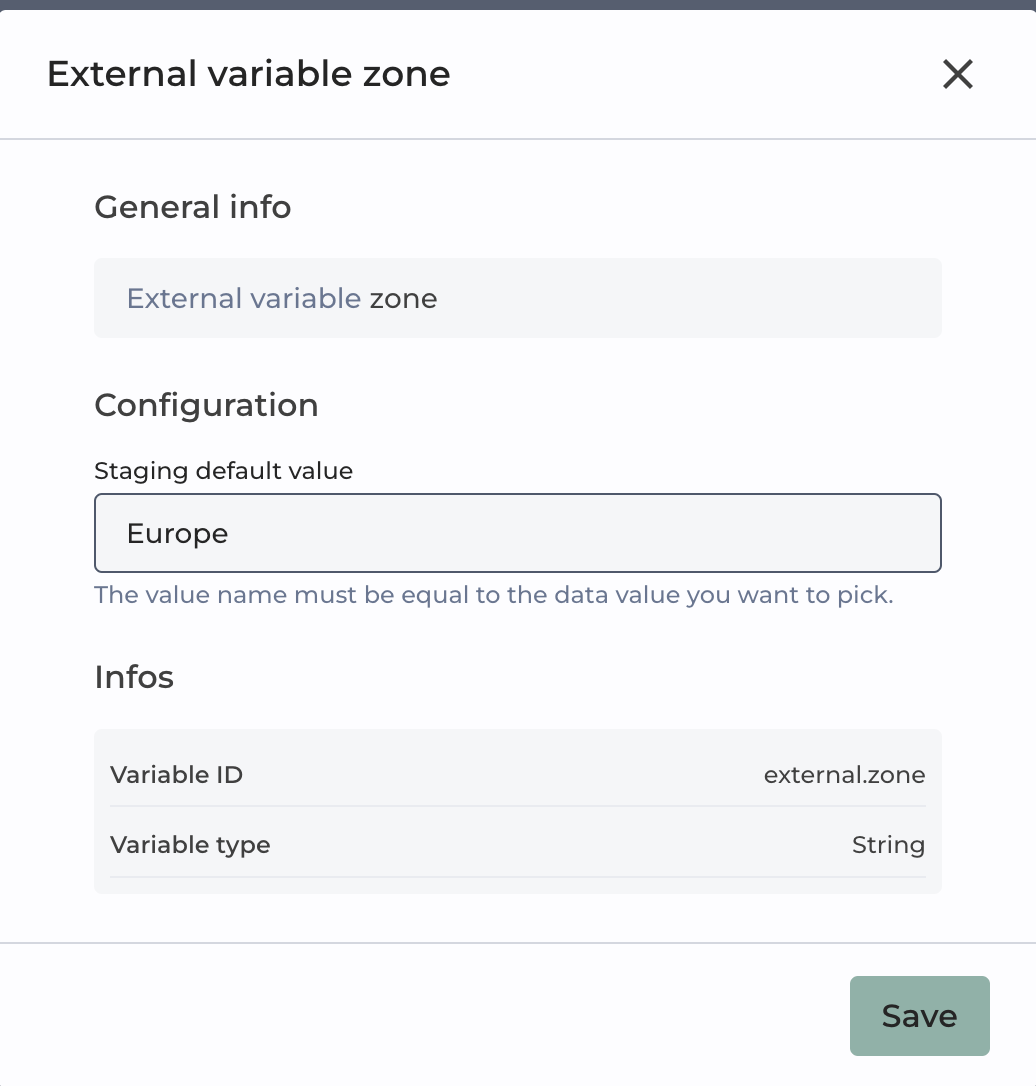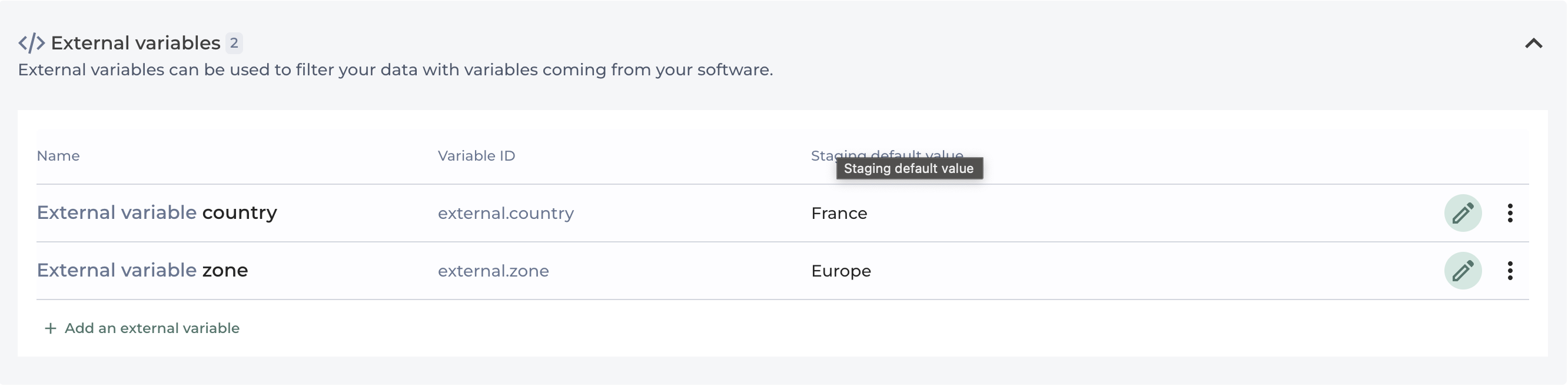 In the example shown in the image, an external variable named "External variable country" with the variable ID `external.country` has been created with a default value set to "France".