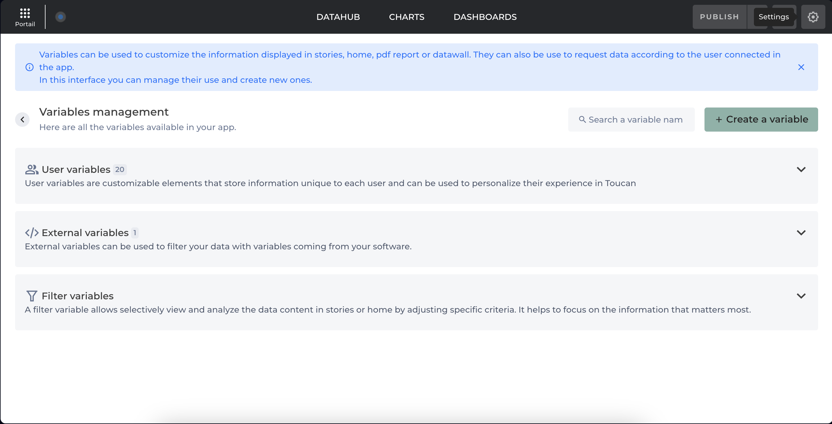 **User variables** and **filter variables** are created from the objects, user properties, and [filters](https://docs-v3.toucantoco.com/visualizations-and-layouts/apps/filters) that you create in Toucan.