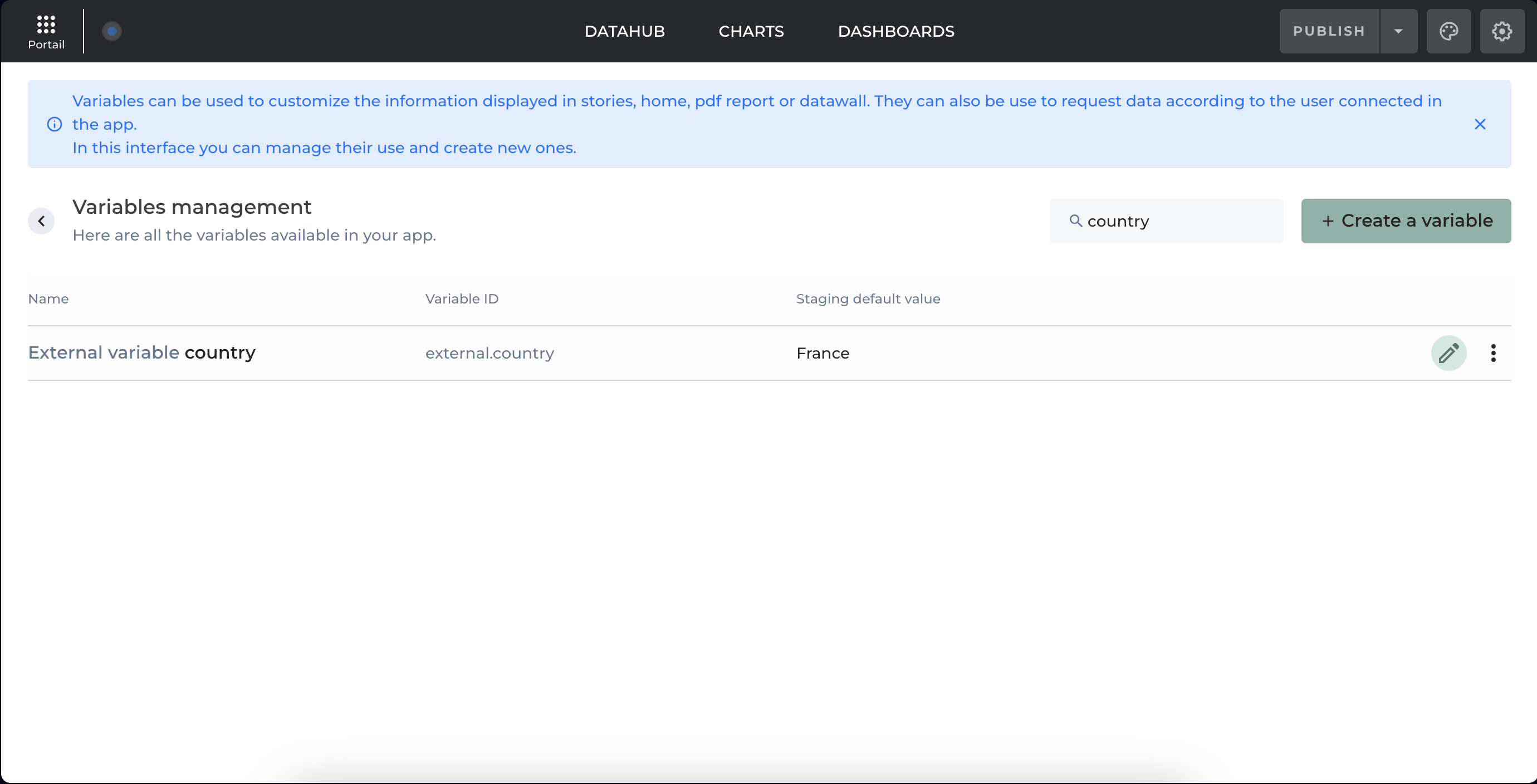 * Click on the `Create a variable` button at the top right of your screen
