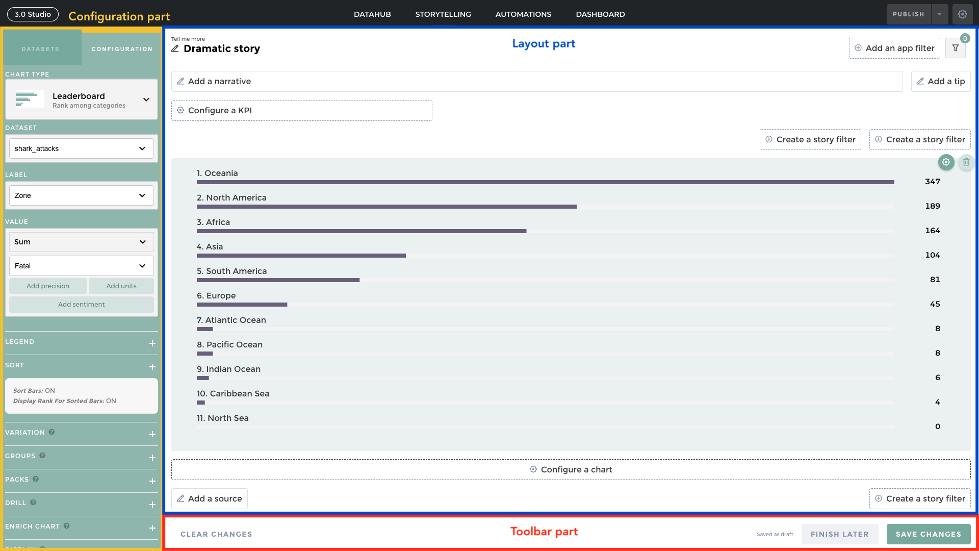 This is the main space in your edition. You can see the framework of your Layout, each element is composed of and configure them, in-situ like **Narratives** or that opens the configuration tab like for **Charts**.
