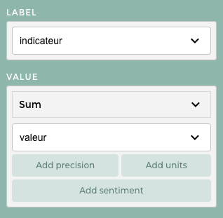 These measures are computed by aggregating the column chosen within the value field grouped by the column chosen within the label field