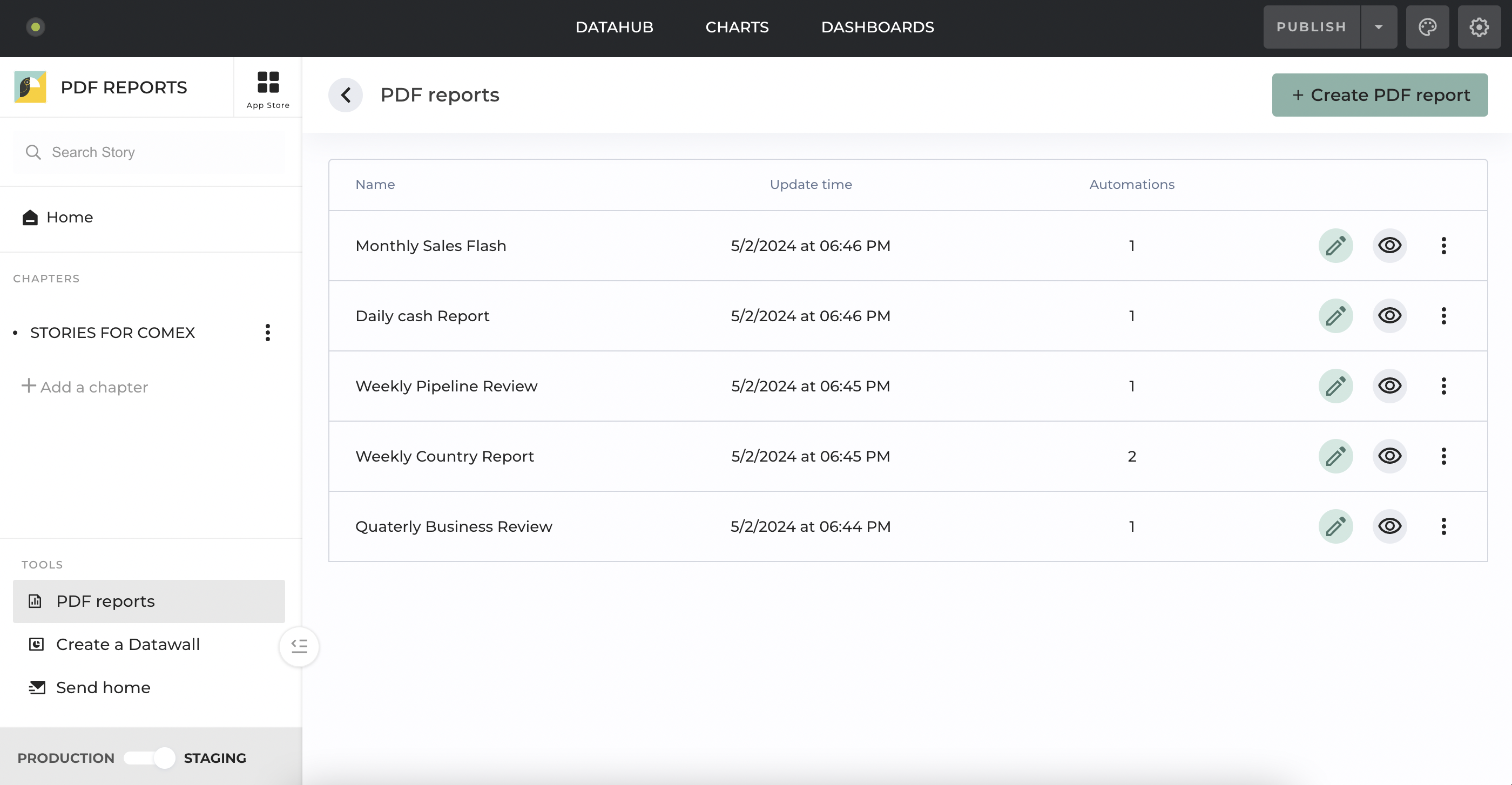A PDF is a static file, but Toucan dynamically generates content depending on visibilities, user permissions, and filter selection. If a story or tile is not visible in the application to some end-users, it won’t be visible in the PDF report either.