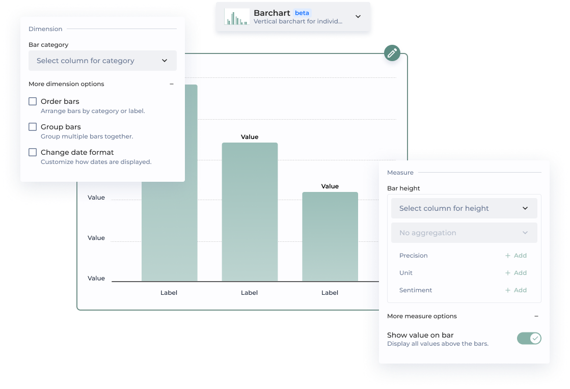 |                           | Order bars              | <p>This option allows to order bars either by column or by custom value.</p><p><em>By column</em></p><p>Bars are ordered based on the selected column. By default, they follow an ascending order—starting with numerical categories, followed by alphabetical (A-Z). This order can be reversed.</p><p><em>By custom value</em></p><p>Bars are ordered based on the selected measure. For example, if the category is 'October' and the bar height is '10', you need to set the value to 10 for this bar to appear first.</p> |
