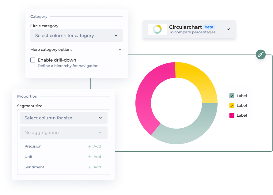 <table><thead><tr><th width="249.33333333333331"></th><th>Option</th><th>How does it work?</th></tr></thead><tbody><tr><td><strong>Category</strong></td><td></td><td></td></tr><tr><td></td><td>Circle category</td><td>The circle category corresponds to a column in your dataset, such as 'Product Type'.</td></tr><tr><td></td><td>Enable drill-down</td><td>Allows users to interactively click on a chart segment to reveal deeper data layers or subcategories.</td></tr><tr><td><strong>Proportion</strong></td><td></td><td></td></tr><tr><td></td><td>Segment size</td><td>Select the aggregation to use, and the column on which the aggregation will be applied</td></tr><tr><td></td><td>Precision</td><td><p>Precision determines the level of detail in how your values are displayed. By default, measures use a <code>.2f</code> format, meaning they are shown with two decimal places.</p><p><strong>Example:</strong><br>A value of <code>3.14159</code> will be displayed as <code>3.14</code> when using <code>.2f</code> formatting.</p></td></tr><tr><td></td><td>Unit</td><td>Unit represents the total quantity or category being measured for a KPI. It defines what the values correspond to, providing context for better interpretation.</td></tr><tr><td></td><td>Sentiment</td><td><p>Four different sentiment statuses (positive, warning, negative, neutral) can be used to color bars, enhancing visual distinction.</p><p><em>Note: Sentiments can be customized in the app theme.</em></p></td></tr><tr><td><strong>Additional parameters</strong></td><td></td><td></td></tr><tr><td></td><td>ID</td><td>Unique chart Id</td></tr><tr><td></td><td>Add complementary value</td><td>The complementary value is displayed in the data label, providing additional context and making it easier for viewers to interpret the data at a glance. It is possible to add a precision, an unit and a sentiment.</td></tr><tr><td></td><td>Add user chart guide</td><td>Lead your chart viewers through the narrative of your data.</td></tr><tr><td><strong>Chart performance</strong></td><td></td><td>Technical performance</td></tr></tbody></table>