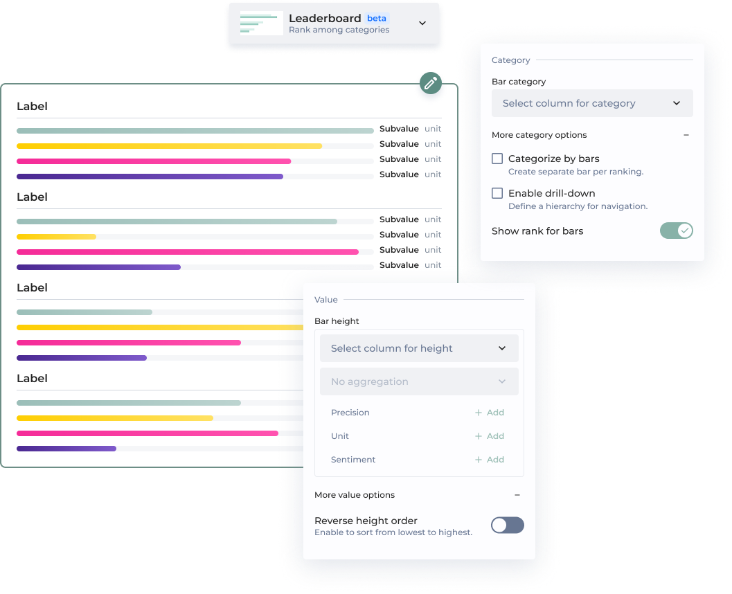 |                           | Category by bars        | Organizes bars into separate categories or groupings, allowing segmented ranking.                                                                                                                                                                                                                                                       |