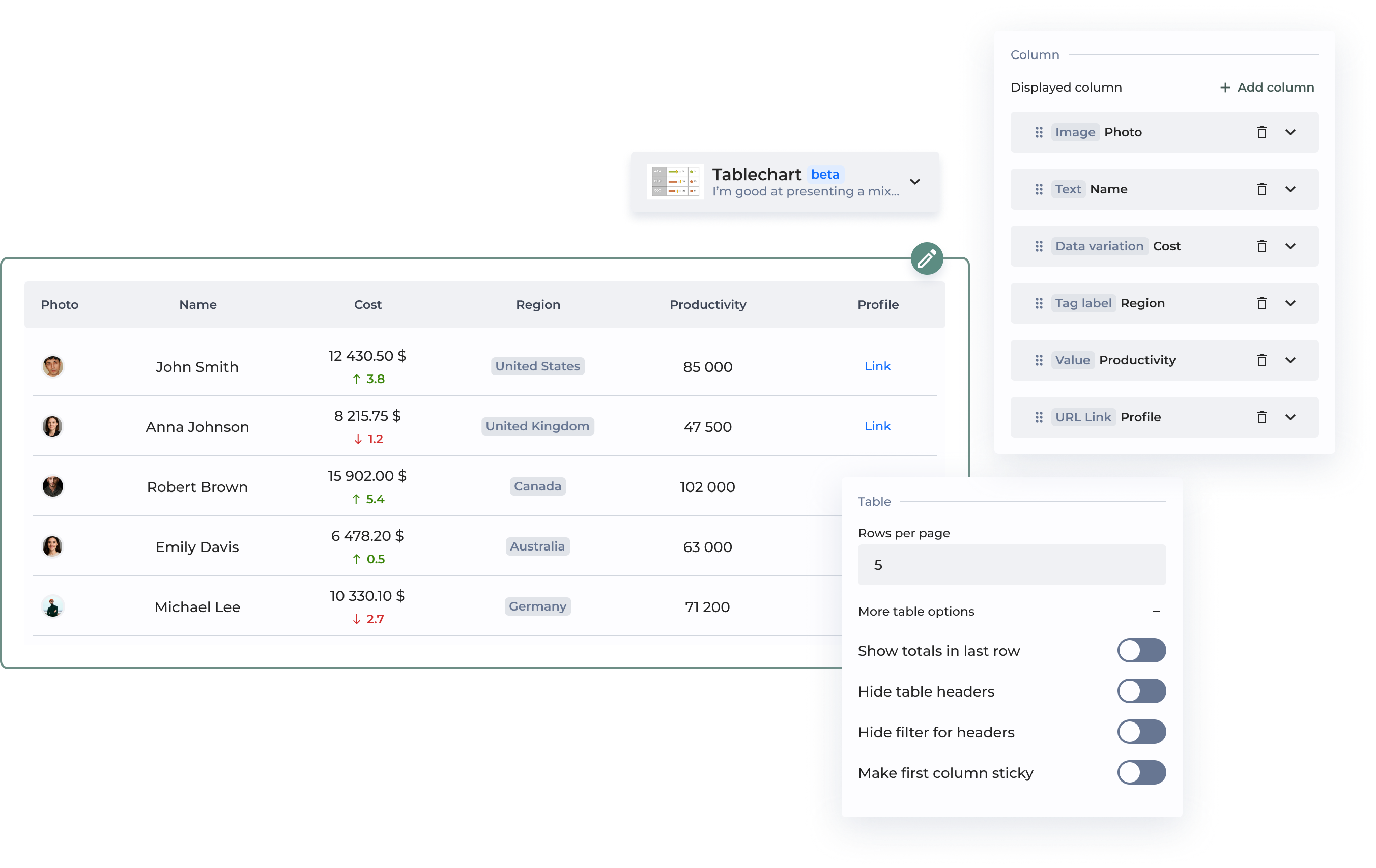 * **Column label:** Rename columns directly in the chart editor